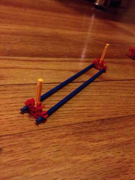Para hacer la base... Conecte una barra azul a cada lado de los conectores rojos. Luego agregar una varilla pequeña amarilla en la parte superior del conector rojo.