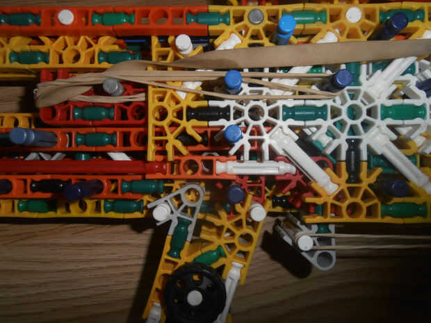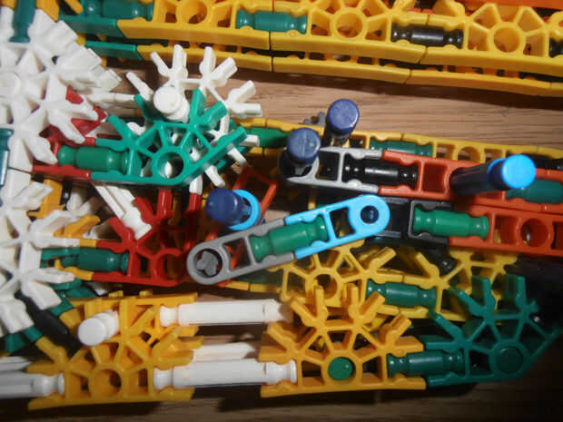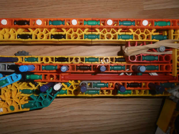 En el medio, hay una fila de conectores amarillos, con las barras del verdes en las ranuras de 45 grados, bloqueando las vigas de flexión hacia dentro.