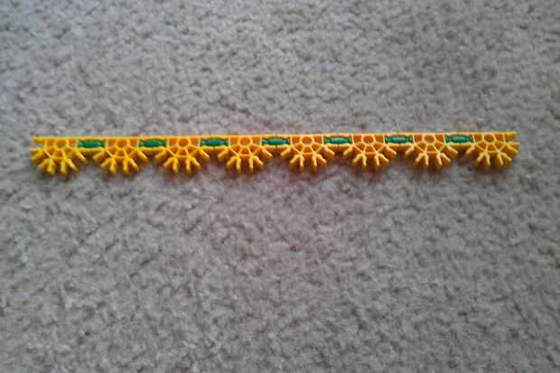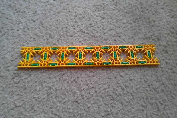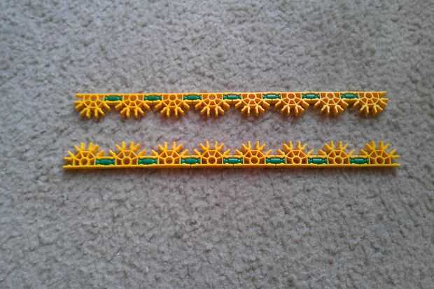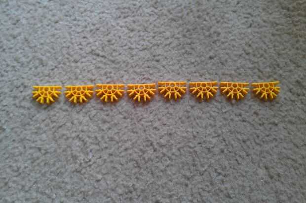 Tomar ocho conectores amarillos y conectarlas usando barras verdes. Repita el procedimiento para obtener dos piezas y conectar las dos piezas utilizando barras verdes.
