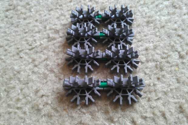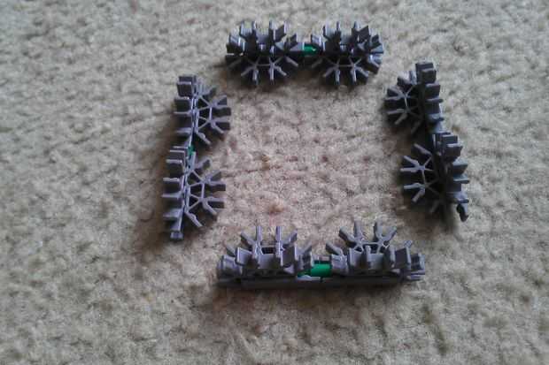 Par las piezas que acaba de hacer y conectarlas usando barras verdes. A continuación, organizar los pares en un cuadrado como se muestra.