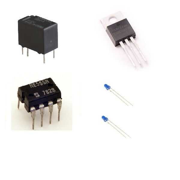 La electrónica está compuesta por: un temporizador 555, un relé de 5V micro, un mosfet IRFZ44N, 2 LEDs, algunos cables eléctricos y un 3.7V 250mah batería, que se potencia el relé.