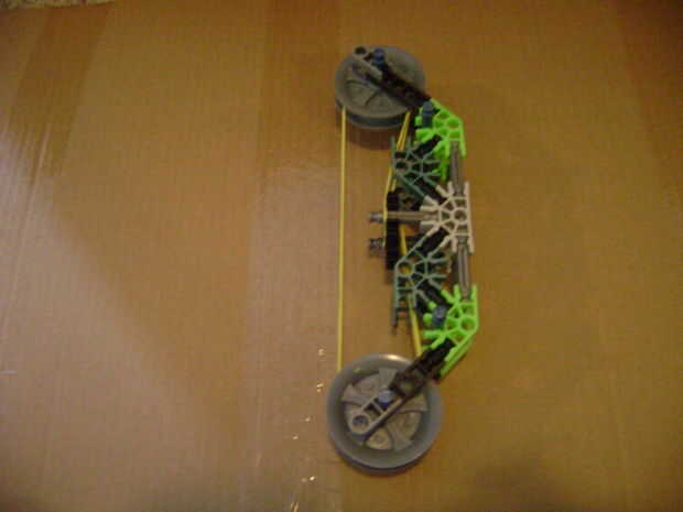 Ahora, de alguna manera expandir las dos bandas de goma en las ruedas al actuar como una cuerda. Luego envuélvalos alrededor de las dos varillas con la pieza de copo de nieve como en la foto.