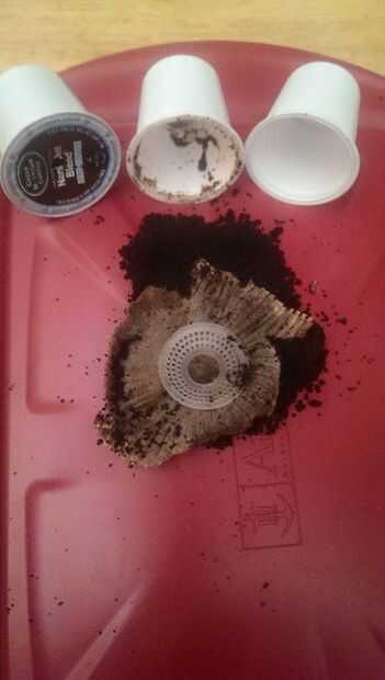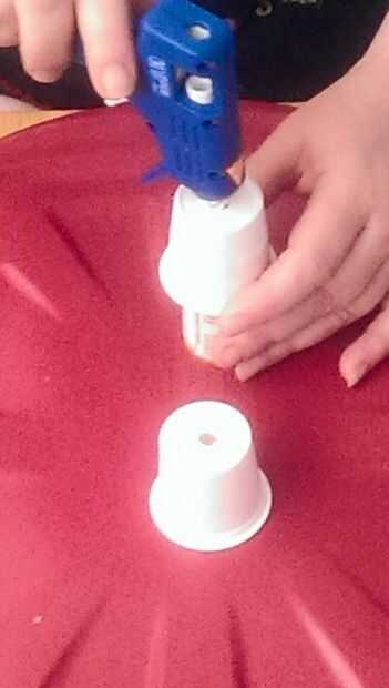 Enchufe el arma de pegamento vacío durante unos diez minutos (no uso un palillo del pegamento). Poner K-Copa boca abajo en la botella de la prescripción que hace más fácil mantener y evitará que se distorsione o agrietado el centrado de la boquilla de la pistola de pegamento y presionando hacia abajo para derretir agujero en centro de K taza que es tan fácil hacer lo hice mirando T.V.