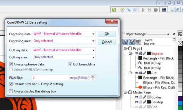 Haga clic en el icono de lápiz verde pequeña en la parte superior de CorelLAZER. Esto lanzará una ventana que permite configurar el formato de la información que va a la cortadora láser. Asegúrese de que la configuración se establece lo siguiente: