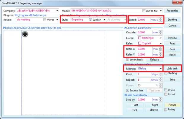Queremos origen que en la parte superior derecha, así establecerConsulte X a 0,0000 y Consulte Y a 0,0000. Mientras que en la ventana de grabado, establecer el método de diálogoy haga clic en agregar tarea. Después de añadir la tarea, debe cerrar la ventana. Esto dice el cortador del laser que esta es una de dos tareas. Además, no es una mala idea para hacer que tu velocidad esté configurada apropiadamente. Creo yo que 175.00 mm/s es una buena velocidad, pero nuevamente todo depende de qué tipo de material estan grabado.