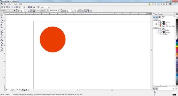 Ahora que todos los preliminares son cuidados permite empezar a diseñar la forma de nuestro colgante. Asegúrese de que está seleccionada la capa de Cut y dibuja un círculo. Hice mi círculo naranja (para la visibilidad) con el diámetro de 3 centímetros.