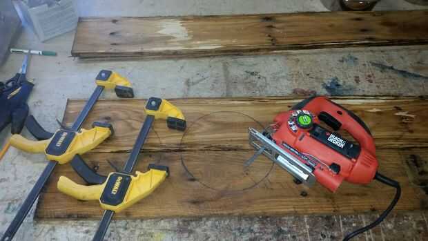 Abrazadera de la placa a su área de trabajo. Con sus rompecabezas, recortar con cuidado los círculos, repita en otra tabla.
