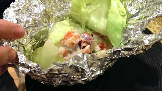 * Etiqueta de cocina adecuado debe utilizarse aquí como el papel y el contenido será caliente, asegúrese de que utilizar horno mits.*Take la bandeja del horno después de 25 minutos. Deje que la hoja se enfríe durante unos 5 minutos o cuando esté lo suficientemente frío como para manejar. Poco a poco separar la hoja lo suficiente para que el contenido puede ser comido mientras que aún dentro de la hoja. Es mejor colocar la hoja en un plato y un tenedor para comer la hamburguesa.  Tener cuidado porque habrá un montón de deliciosos jugos en la parte inferior que estará caliente. ¡ Disfrute!