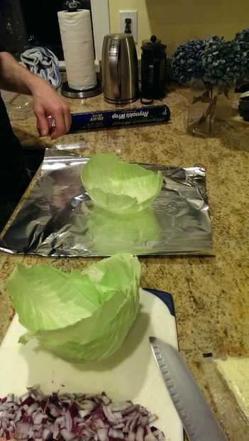 Necesita romper 2 hojas de col por burger. Las hojas no deben tener ningún rompe en ellos. Es preferible usar las hojas en el borde externo de la col ya que éstas son las más grandes y llevará a cabo la mayoría de los ingredientes. Luego cortar un pedazo de papel que es significativamente más grande que la hoja de modo que cuando se coloca sobre él, la lámina completamente de encajonar el repollo.