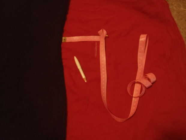 Para obtener la dimensión correcta pone una camiseta equipada en el centro del material todavía doblado (alineado con el orificio del cuello). De donde la camiseta se curva más (Dónde está tu cintura) Mida 10cm. Luego dibuje una línea de 5cm para el lazo de la correa ir a través (hacer más grandes o más pequeñas dependiendo del tamaño de las correas). Repita para el otro lado asegurar son de igual distancia desde el borde exterior. Dibujar la línea en la pieza posterior también.