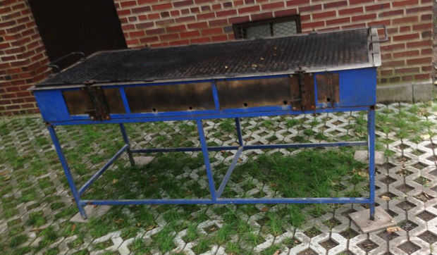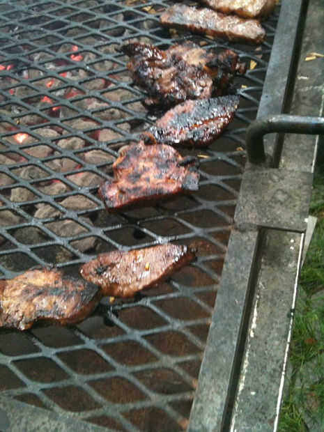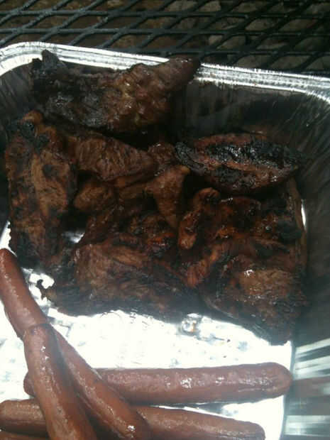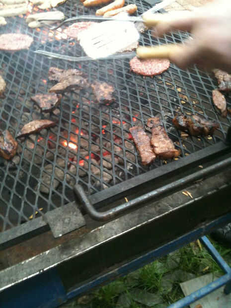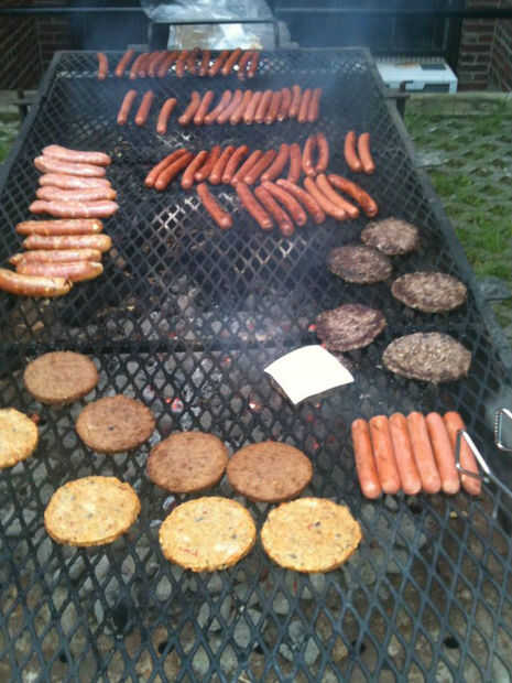 Este lote que cocinados en una parrilla de monstruo. Toma dos personas y 3 bolsas de carbón a trabajar éste. Por suerte mi hijo estaba allí. Hay alrededor de 20 libras de carne de res en esta parrilla e incluso algunos perros de verduras y 2 clases de hamburguesas vegetales para los que quieren.