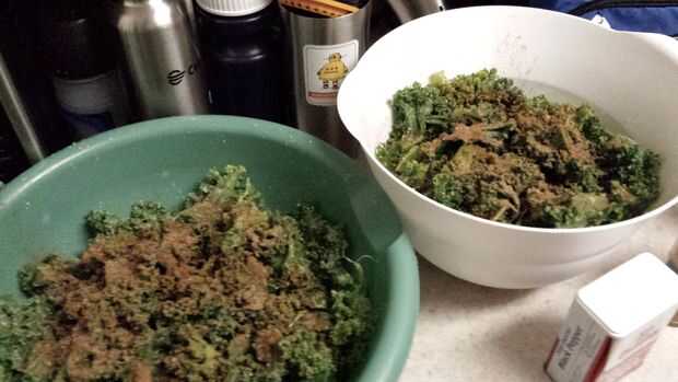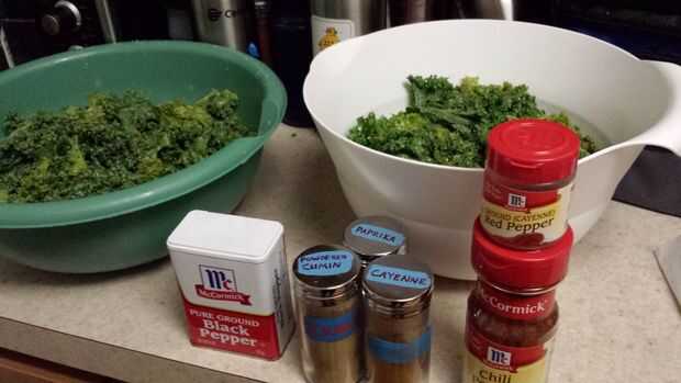 Por ahora, usted sabe el taladro... empezar a mezclar todo a mano. Realmente vale la pena pasar el tiempo aquí para mezclar y frotar las especias a través de todas las hojas, incluso si se ven bien mezclados. Lo último que quieres es un grupo de Chile en polvo escondido en algunos volantes en un chip de kale dándole una dosis fuerte de calor mientras es merendar.