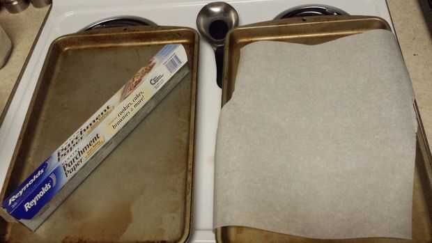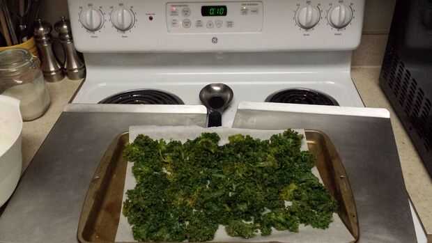 Una vez que su papel está en su lugar, endecha la sazonada, cheesed kale en el papel de pergamino en una sola capa, intentando lo mejor que puede extiende las hojas y no los apile. Puede estar cerca o tocando, pero debe ser en una sola capa. Para el lote que hice, necesitaba cuatro hojas para hornear para hornear toda la masa.