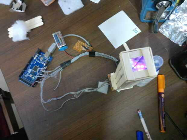 Conecte cada transistor base a cada seleccionado columnpin (8,9,10 en mi código) y la llevó a bien, los pines 2,3,4 o ledpins []... Pegue una base para sostener la placa Arduino y matriz. Puse bandas de goma para fijar el Arduino. Montar los leds en la parte trasera del caleidoscopio, conecte la energía, cargar el código y listo, tu kalediscope está listo!