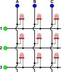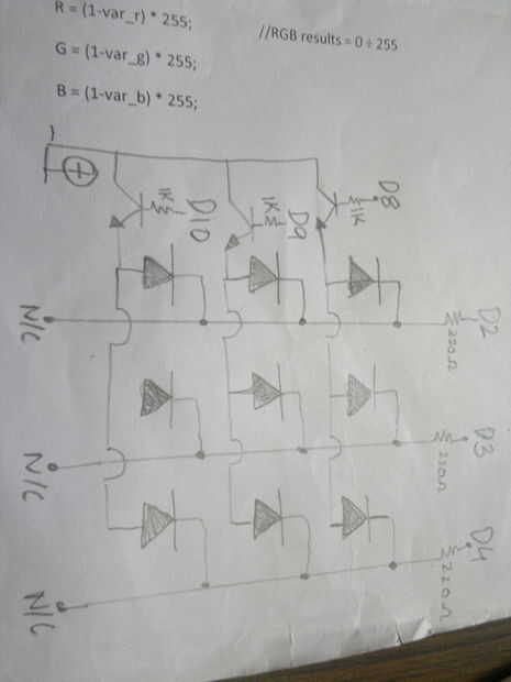 Hay 9 LEDs, que son controlados con un Arduino usando una técnica llamada multiplexión. Este artículo le hará entender la teoría de la multiplexación LEDs bien. Ignorar la parte de circuito sin embargo, es muy diferente de este.