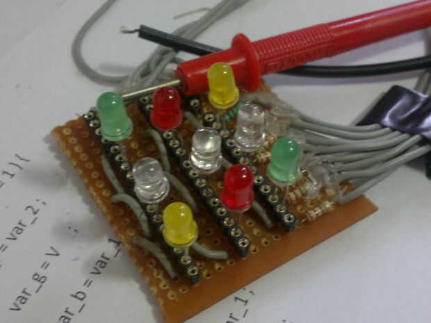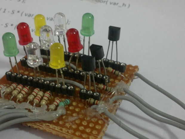 No soldar directamente LEDs y transistores, pero utiliza la toma de corriente. Es una buena idea-puede modificar o solucionar más adelante fácilmente. Después de soldar los enchufes, poner los LEDs. Recuerde cortar un poco de plomo de los LED para que no sea demasiado largo. Añadir también los transistores.