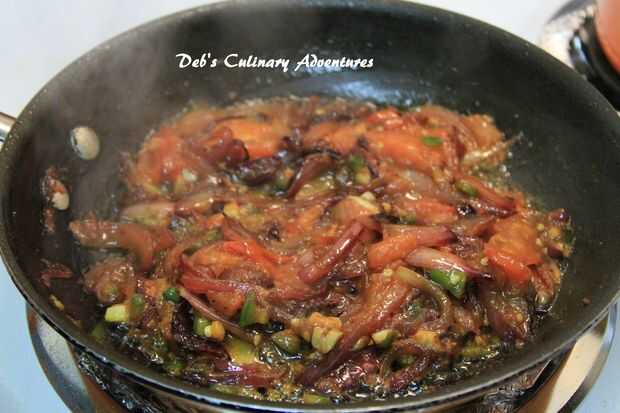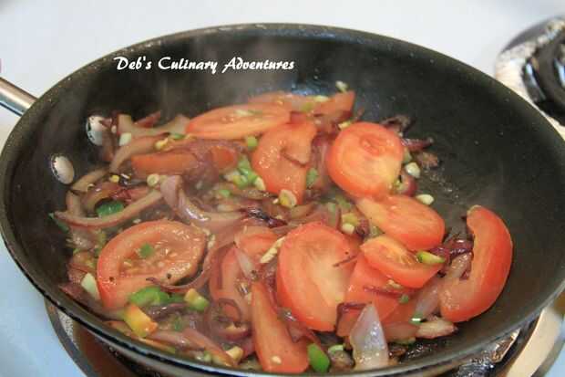 6. Agregue el ajo, chiles verdes y tomate y se fríen hasta que el tomate se convierte en suave.