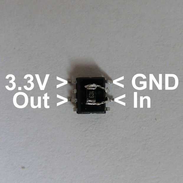 He cortado sin usar alfileres para que no toquen la PCB, pero no totalmente así que puedo hacer actualizaciones de software en el futuro. Nota que resistencia de pullup ahora deberías estar conectado a la patilla superior izquierda 3, 3V en lugar de pin 7.