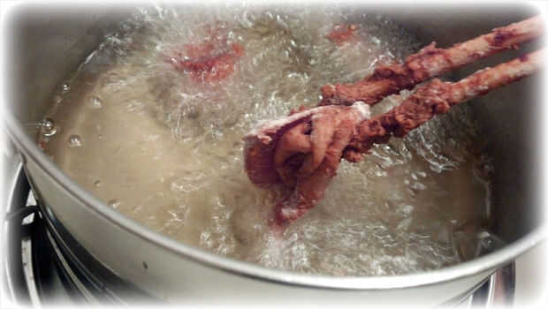 Una vez que se ha frito todo tu pollo, ráfaga del calor a alta y descarga todo el pollo de nuevo en el aceite para una segunda República Federativa de Yugoslavia (ver última foto).