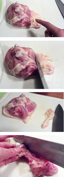 Si compraste los muslos con el hueso todavía en ellos, corte alrededor del hueso para sacar la carne (ver foto).