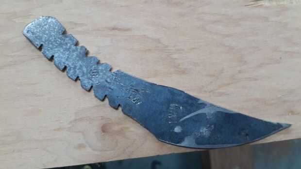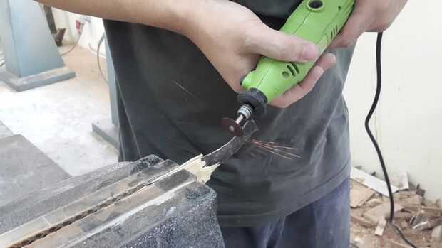 5. luego usando la herramienta giratoria con un disco de corte hacer algunas muescas como dientes de sierra un tang, asegúrese que las muescas se forma como en la foto, esto asegurará que la hoja se adherirá firmemente a la manija.