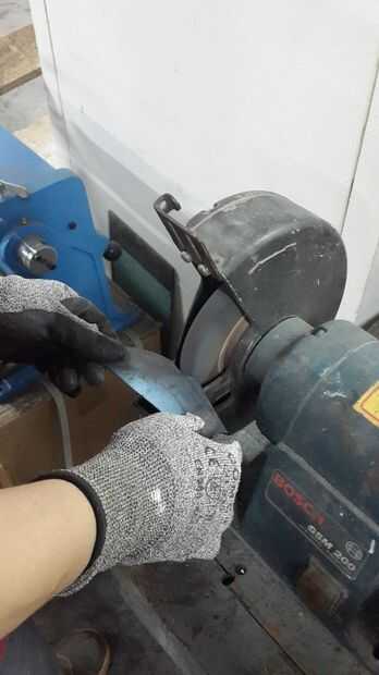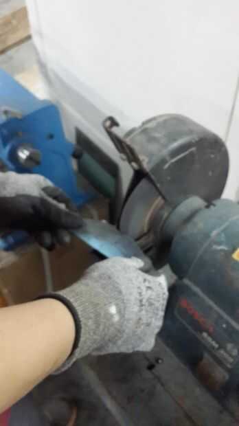 3. Utilice la amoladora de banco de piedra rueda piedra áspera para moldear la forma de la hoja. (puede utilizar una pinza alicate para hacer esto, ya que la hoja se pondrá muy caliente de la fricción)