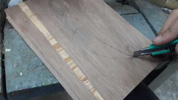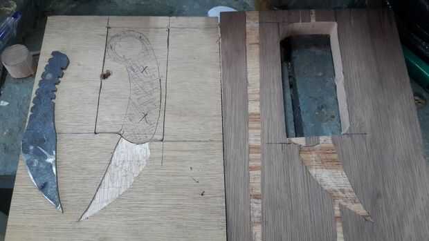 2. en la madera de teca, corte la parte de la hoja que se no encuentra en el trazo de la manija. Pero recortar solo la capa más externa de la madera de teca. Madera de teca que tiene 5 capas: capa externa 2, 2 capa media y el núcleo central. básicamente usted pela la cosa.