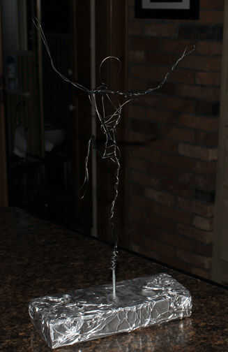 Ir a The home depot o una ferretería y comprar un carrete de alambre tubo de estufa. Esto dobla muy fácilmente y le permite envolver alrededor de sí mismo para obtener aproximadamente una forma humana. Usé un maniquí dibujo para obtener la proporción correcta. luego montó una pieza de 2 x 4 cubiertas en papel de aluminio. Utilice un tornillo grande para montarlo para poder envolver el alambre del pie alrededor de él fácilmente. Elegí su pose de la famosa grúa.