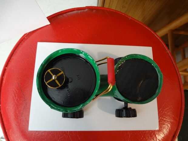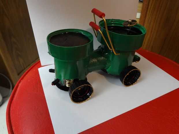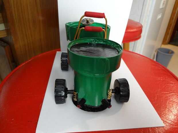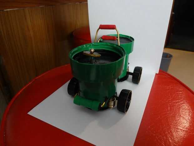 hice el volante cortando 2 pequeños círculos de cartulina y caliente les pegan. He utilizado el extremo de uno de los resortes de la pluma había cortado apagado como exceso de uno de los resortes como la columna de dirección. Taladré un agujero en los volantes y parte superior frontal del kart para pasar a través de la columna de dirección y caliente lo pegado en lugar. solía craft wire & más el cartón paja para hacer el manillar grande y pequeño para el piloto trasero. Perforar agujeros en el cuerpo de la nave y fije las barras de alambre en su lugar y agrega pegamento. Entonces me dieron 2 pequeñas piezas negras que estaban dentro de las plumas de la tinta a utilizar como los tubos de escape traseros. Perfore agujeros hacia fuera y pegado en lugar. Luego pinté todos los pequeños detalles en oro alrededor de las ruedas exteriores, el rojo en las ruedas interiores, oro en el centro de las ruedas, oro en volante, rojo en pastillas de manillar, y consejos de escape rojo en.
