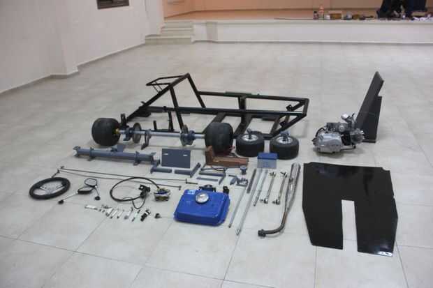 Usé las ruedas de kart, moto frenos y un motor de 4 tiempos 110 cc con transmisión de 4 velocidades.