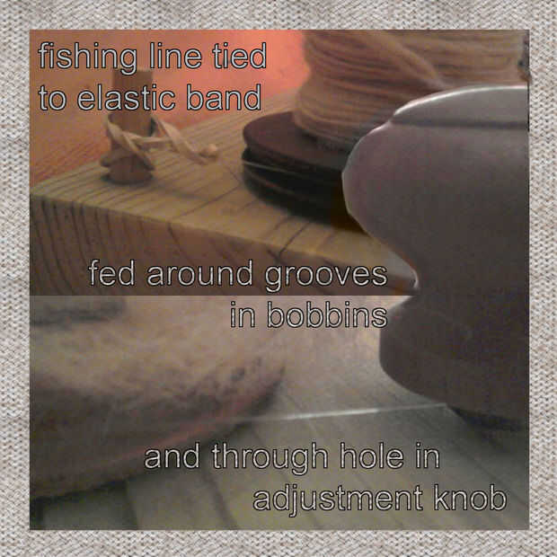 Soporte sus bobinas en los montantes, atar el sedal a la venda de elástico en la espiga derecha, alimentan alrededor de las ranuras de las bobinas y finalmente a través del orificio en la perilla de ajuste a la izquierda. Si nunca has afinado el instrumento de un cuerda habrá averiguado lo que está sucediendo aquí. (Si no ha un instrumento de cuerda, necesitará dejar un par de pulgadas de holgura y gire la perilla para apretar hacia arriba).