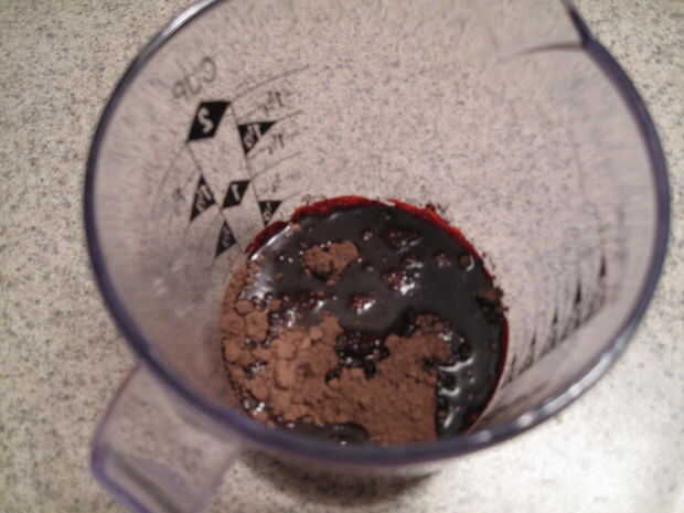 -En un tazón pequeño, bata juntos el colorante de alimento, polvo de cacao y vainilla. Añadir a la mezcla y batir bien.