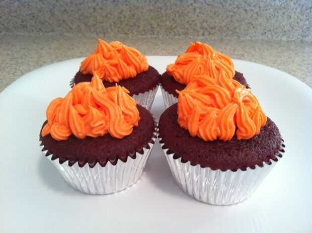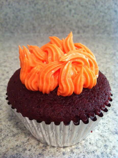 -Utilizando una manga pastelera y punta #18 tuberías, pipa cada llama - mantenga la duya hacia arriba, apriete la bolsa mientras levantando, detener y liberar. Repita hasta que la parte superior de la Magdalena se cubre de escarcha "llamas".