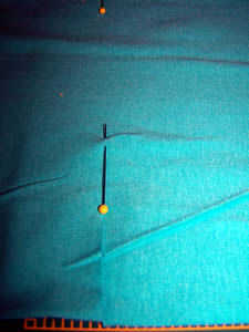 Perno de la camiseta a lo largo de la línea que usted necesita para cortar. Puede utilizar tiza para marcar la línea de corte si quieres.