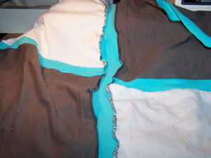Como se puede ver en esta foto de la parte superior, utiliza el azul para formar una franja por la mitad horizontalmente y verticalmente y luego marrón y las camisas de color blanco roto para constituir un patrón general para mi mosaico.