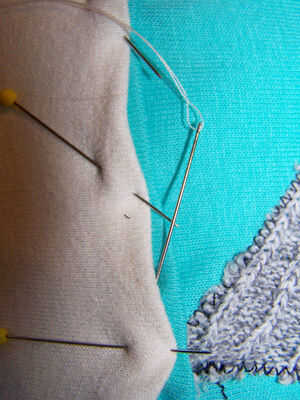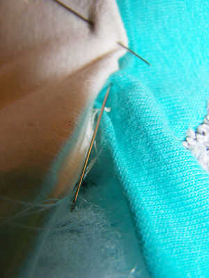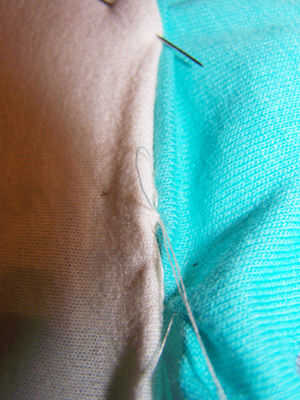Coloque la aguja sobre una 1/2" sobre el principio de la apertura. Páselo a través para ocultar el nudo dentro de la costura. La idea con el blindstitch es ocultar puntos de sutura.