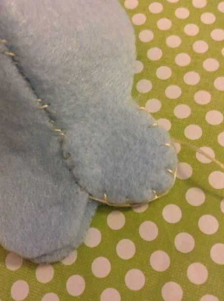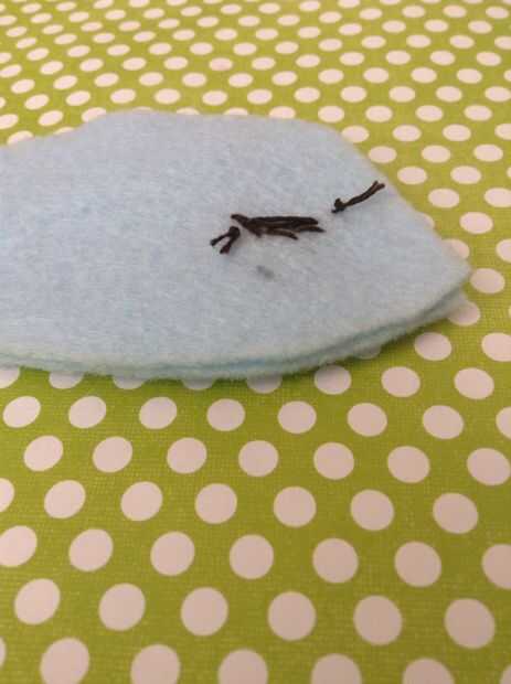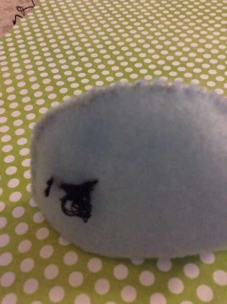 Poner las piezas de adentro hacia afuera y coser hasta el final de la cola. Entonces, necesita revertir el peluche de la manera correcta y poner la parte de peces de fieltro debajo de la parte que tienes ahora. Punto de ribete alrededor de la cola.
