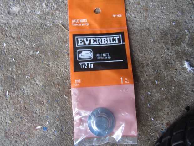 Tuerca de eje de 1/2": Estos golpee en el extremo de la barra del árbol para asegurar la rueda. Incluyo la foto de la bolsa porque nadie en casa Depot podría decirme lo que fueron llamados, por lo que no podían ver en sus equipos se encuentra. Todo el mundo sabía lo que estaba hablando, aunque, sino porque son un pequeño artículo en una tienda enorme tomó un rato para encontrarlos.