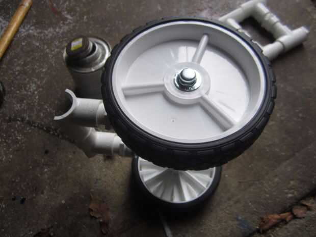 Una vez que es el eje y las ruedas están en, use una tuerca de eje para mantener en. Una vez más, Home Depot podría no nombrarlas (pensé que se llamaban "caps") así que aquí tenéis una foto. Encenderse con un martillo y encendida.