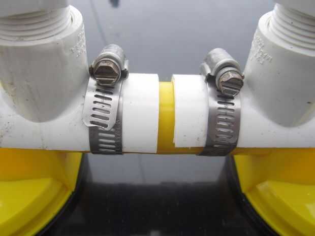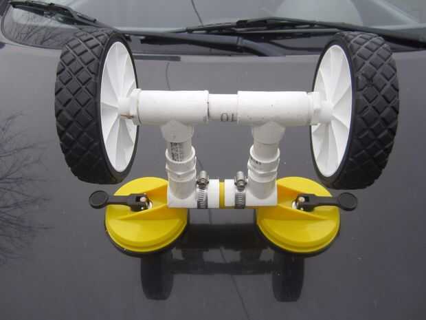 Originalmente, había pensado utilizar cemento de PVC para sujetar el marco a las tazas de la succión doble. 1" tes, cortar, no coincide absolutamente con el arco de la ventosa doble asas así que hubiera tenido que fije para el secado, no estaba claro si la tensión estando presente y, eventualmente, hacer que suelte en un momento inoportuno. Más importante, mediante el uso de las abrazaderas de mi mamá puede ajustar el ángulo del marco una vez que las ventosas dobles se unen a su coche. Uno será en su tronco, mientras que el otro en el parabrisas trasero. En este momento, no sé si serán necesario ajustes o una recta vertical hará el truco. En el uso de abrazaderas, mi mamá ya tengo opciones.