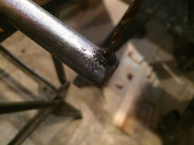 Taladrar los agujeros para los pasadores en el borde del eje. Los pernos que usé eran 1/8, usé un 5/32" bits. Un toque de aceite de motor en el orificio había dejado el chillido de la broca.