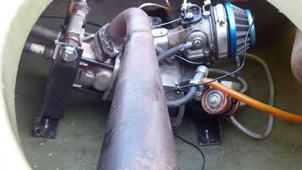 el escape era original yo solo corte y re en ángulo para que quepa. También he desmontado el extremo superior del motor y había volteado porque los gases de escape hubiera sido salir en la parte inferior de la embarcación y podrían haber derretido el plástico inferior. así que me salga la parte superior