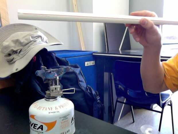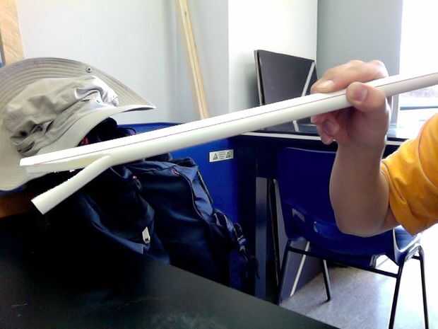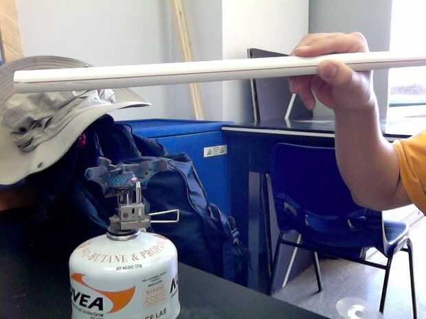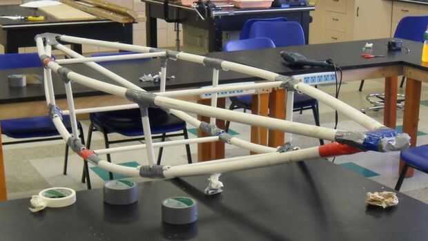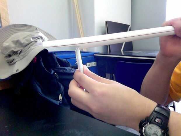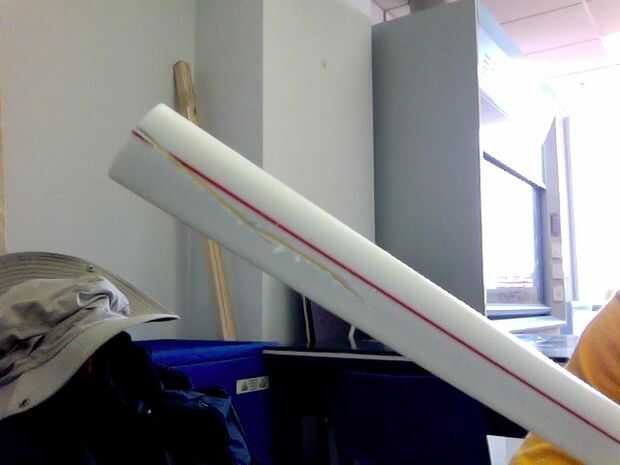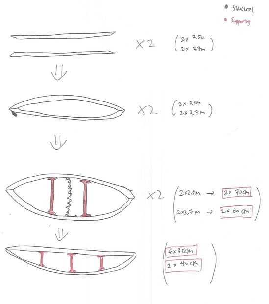 Al marco estructural. Asegurándose de que los recortes enfrentarán, conecte los dos segmentos de 2.5m en dos extremos con cinta adhesiva. Es importante que usted cinta firmemente. De lo contrario, el barco puede romper y fregadero. Si tienes el pegamento, puede aplicar pegamento epóxico a la superficie de Unión.