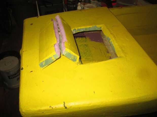 verás que he probado una baraja diferente y diseño de la portilla para comenzar con. Mi primera idea era cubiertas de espuma de 1" con compuertas simples en ellos. las portillas tenían bordes biselados para ellos y una bisagra de tela.