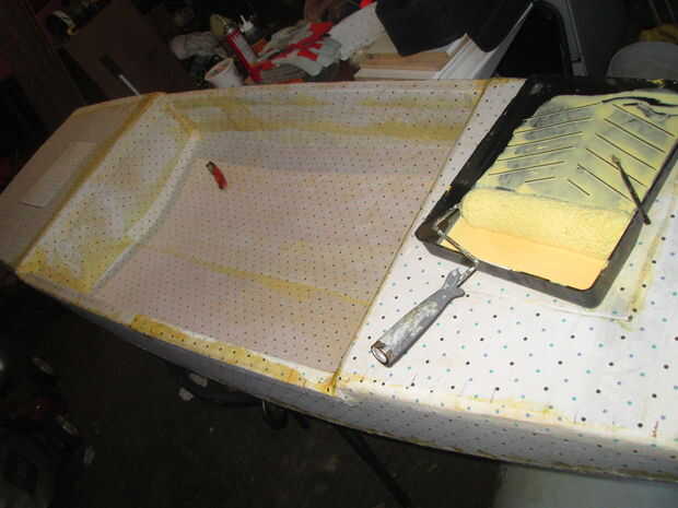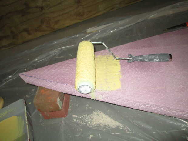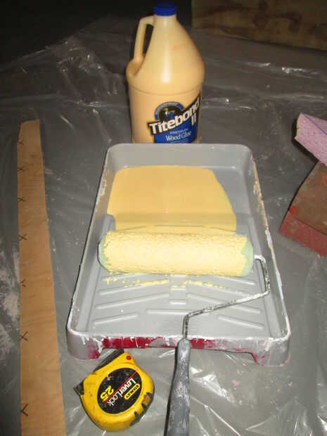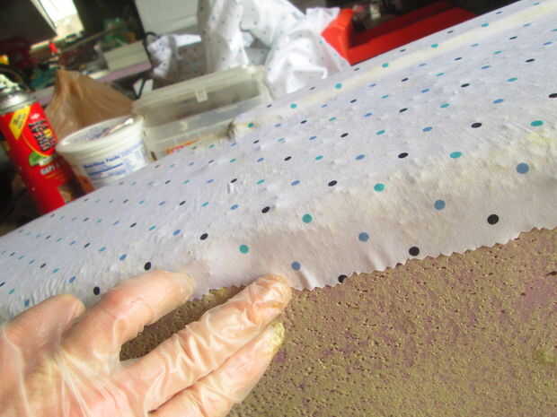 En primer lugar el rodillo en una capa fina de pegamento, se puede saber usted tiene suficiente pegamento, cuando todos los poros en la espuma causada por perforaciones, tiene un punto de pegamento en ella. luego trabajar a la tela en la cola con las manos enguantadas, eliminar protuberancias o arrugas y estirar y alisar a la tela en el pegamento. Desde que puse el pegamento en la delgada y pegajosa, la tela pegado rápido rápido, que me permita ir al panel siguiente.