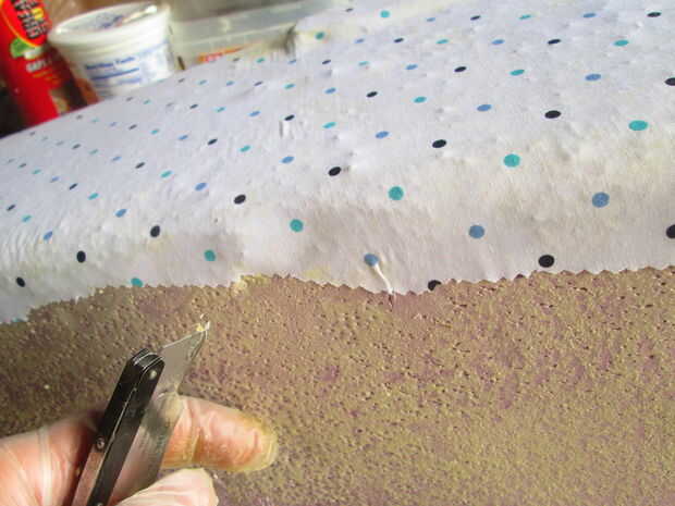 Como mostré antes, corté unos gajos en los bordes de algunos paneles y perezoso y me acaba de dejar sin cortar los solapes. Cuando pegado a abajo, se forman las arrugas, me le corte la parte superior de la arruga con la maquinilla de afeitar, luego pegamento en ambos bordes abajo de plano. Esto es mucho más fácil y más rápido, y no terminas con cortes extras donde no los necesita.