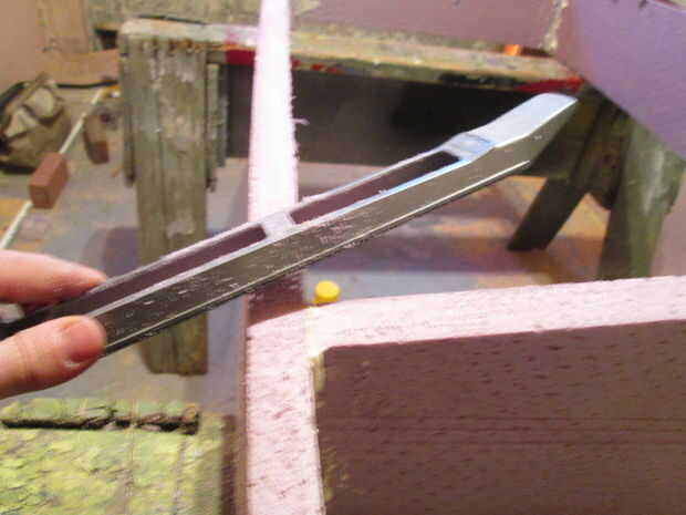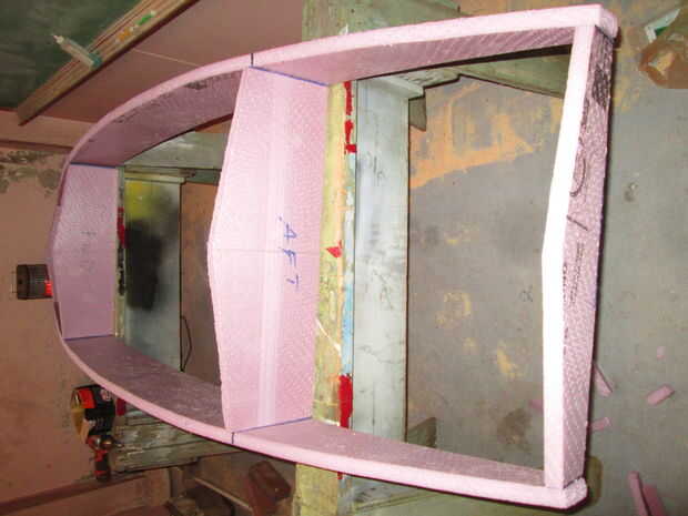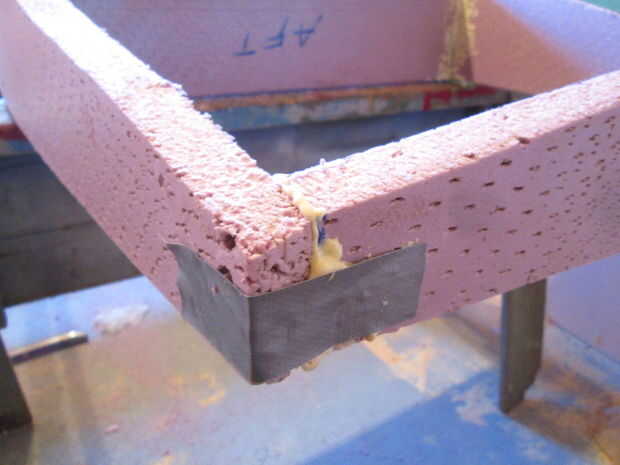 Una vez más la espuma 1" causa otro problema, cuando se acortó los mamparos no coinciden los a las nuevas dimensiones de extremo (notar el espacio bajo la sureform), que le ayudará si marca donde los dos paneles se reúnen en el borde inferior, dibuja una nueva línea desde allí hasta el punto de la V en la línea central, luego cortan el tabique a la nueva dimensión.