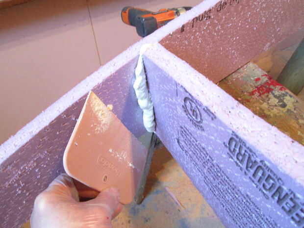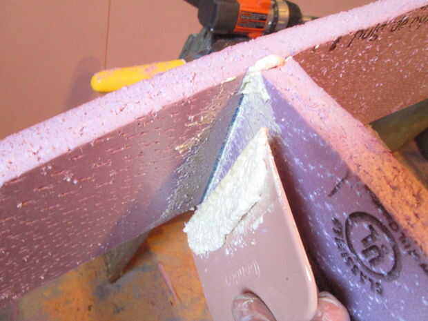 En el borde de la espuma de una pulgada, una tira de 1/2 pulgada de mostaza como GS fue más que suficiente para llenar la brecha y exudar hacia fuera. Una vez que la articulación esté en su lugar que utilicé tornillos de drywall rosca gruesa para todo juntos, en las articulaciones ver tensión en el tornillo, usé cinta adhesiva para asegurarse de que no saque los tornillos.