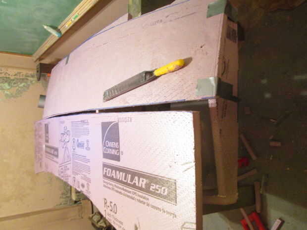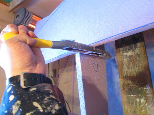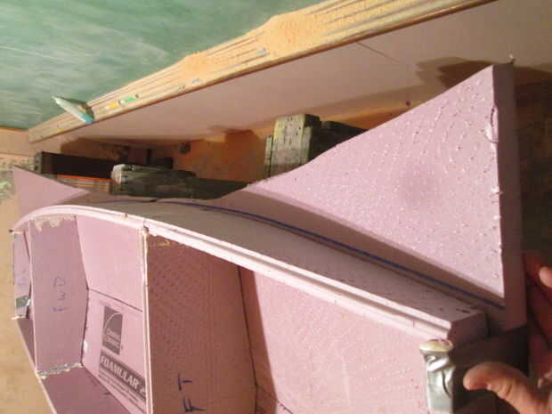 Luego utilicé una sierra de panel de yeso para recortar los bordes de los paneles de fondo que quedaron sin cortar cuando corte los paneles laterales. dejando una pequeña repisa extra espuma para el ajuste final. Este es el momento de comprobar la forma del bisel donde se unen los lados y la parte inferior...