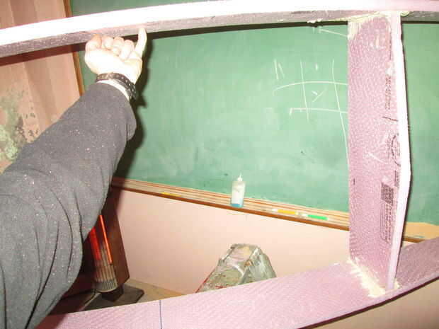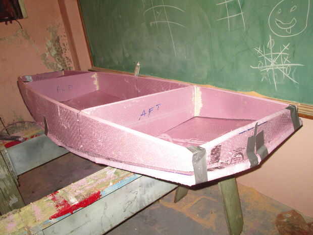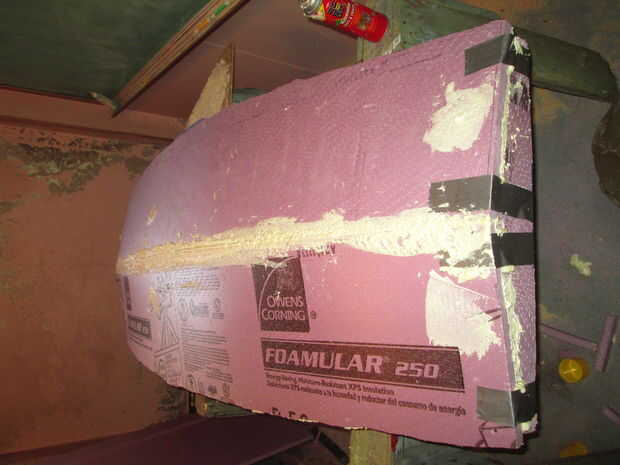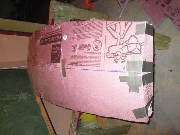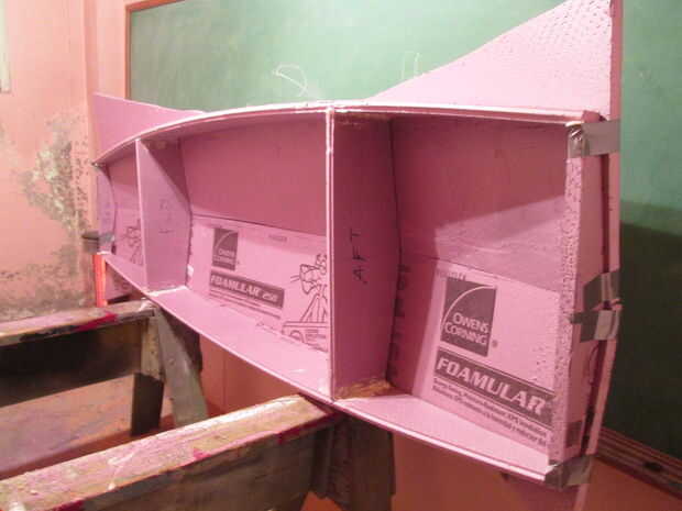 Una vez que estaba contento con los cartabones y el ajuste general de la parte inferior quitó uno mitad de la parte inferior y pega en con más GS, con cintas y tornillos para sostenerlo en lugar. Luego he quitado la otra mitad y había pegado en la. cinta adhesiva a lo largo de la costura V tendría mantenga el GS de espuma tan mal en el interior, en el exterior espuma extra fino es como se puede todos ser enarenado apagado fácilmente.